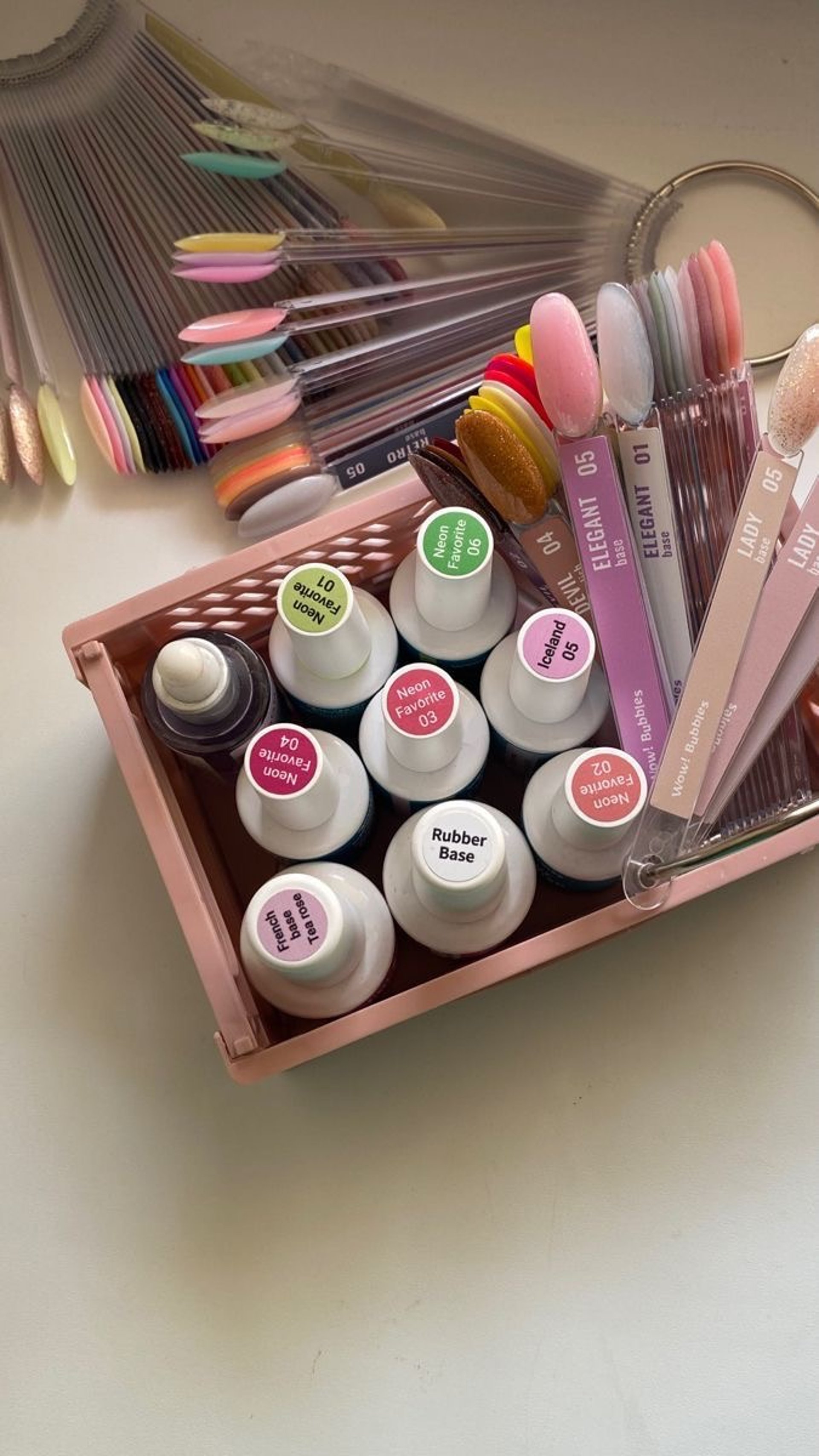 Dividi per categorie (gel, strumenti, decorazioni) e tieni a portata di mano quello che usi di più.